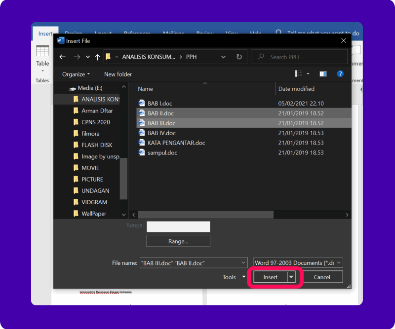 - Selanjutnya cari dokumen yang akan digabungkan kemudian pilih Insert, kamu dapat memilih beberapa file sekaligus